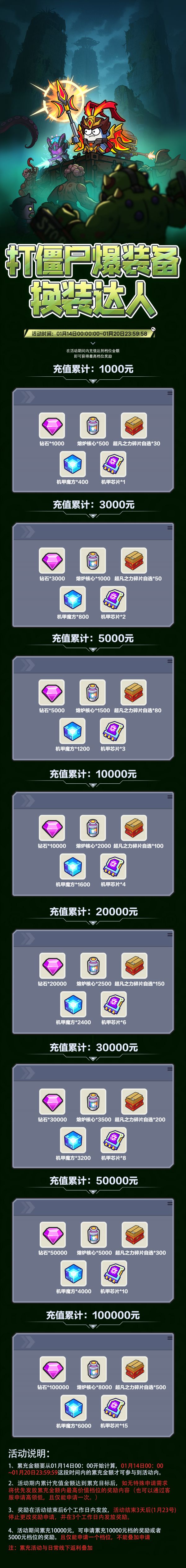 1、累充金额要从1月14日00: 00开始计算, 1月14日00: 00~1月20日23:59:59这段时间内的累充金额才可参与到活动内。