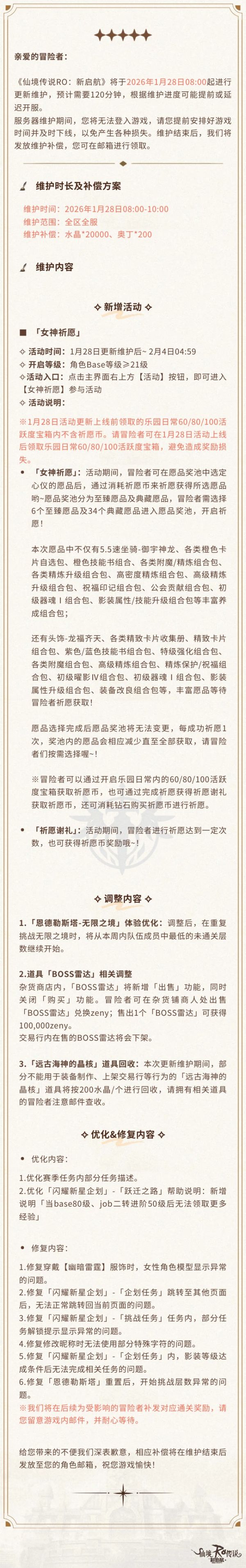 《仙境传说RO:新启航》将于2026年1月28日08:00起进行更新维护,预计需要120分钟,根据维护进度可能提前或延迟开服。
