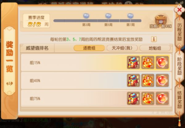 逐鹿组阶段奖励为天冲组的2倍,排名前15%的帮派可额外获得2个超级幻色丹,为帮派成员提供个性化外观选择。