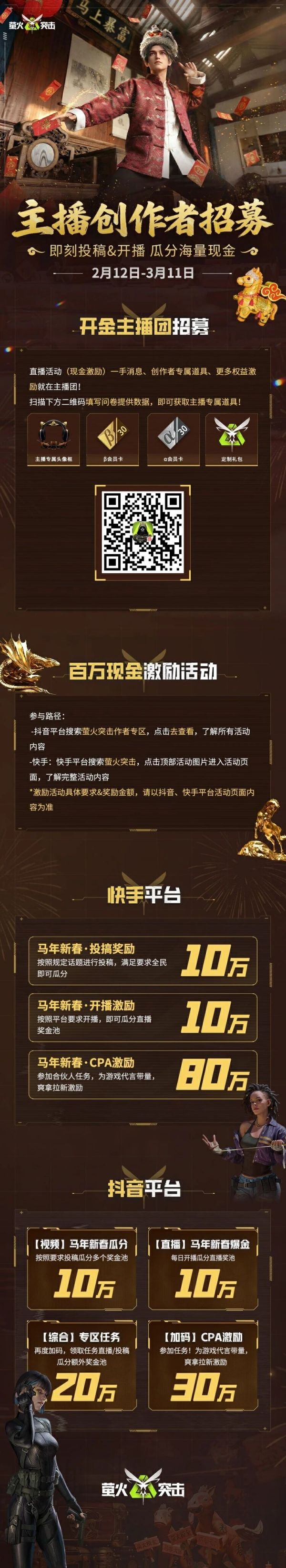 2月12日-3月11日,根据指定主题在快手、抖音平台投稿/开播;符合相关要求,瓜分海量现金!