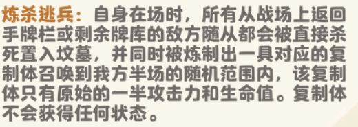 该技能是恶魔领主的终极技能,将在恶魔领主达到5级时习得,是一个解场控场,反败为胜的大招,但需搭配其他随从或技能卡打出效果,当敌方随从返回手牌或牌库时,将被恶魔领主直接击杀,并生成对应复制体效忠于我方,且该复制体可以释放本体的技能!!当复制体达到2个时,还将进一步强化2技能,打出全场控制的效果!!