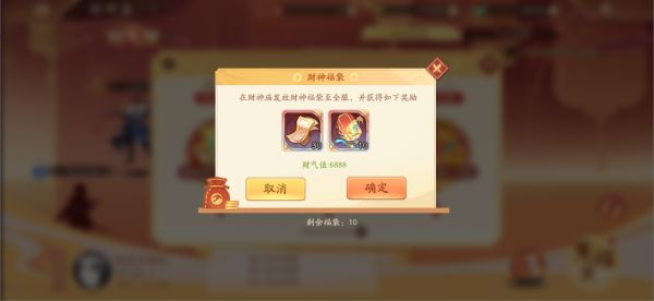 1.通过活动或购买获得的福袋,将存放在【财神庙】中。玩家成功发放福袋后,将立即获得一份固定的【福袋奖励】(包括守岁金券和祈福天灯)和【财气值】。