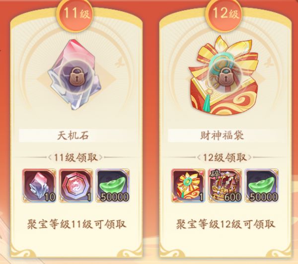 活动期间限时“新春聚宝”同步开启,活动期间任意充值均可叠加聚宝等级进度,聚宝等级提升后即可领取大量虹金碎片以及四灵符石、天机石、财神福袋等珍稀道具,助力战力直线飙升!