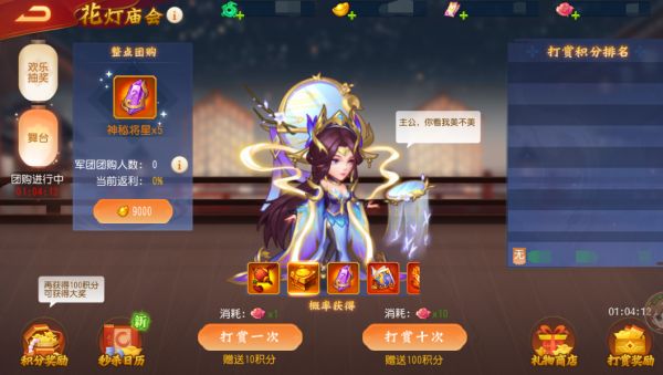 2、主公可以在积分排行榜开放时进行欢乐抽奖、舞台打赏,获得活动专属奖励和活动积分,活动积分可以参与每轮的积分排行榜排名。