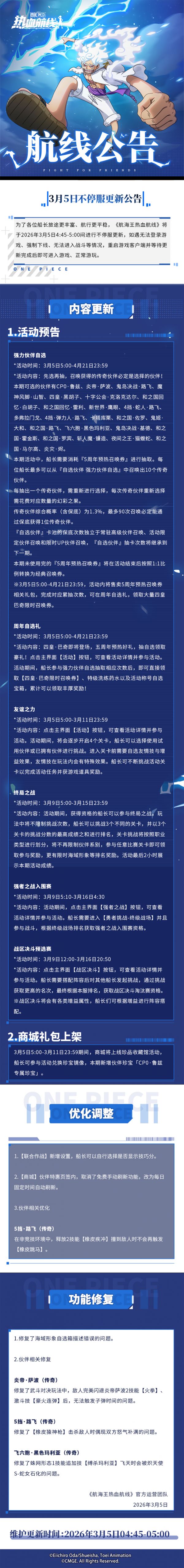 为了各位船长旅途更丰富、航行更平稳,《航海王热血航线》将于2026年3月5日4:45-5:00间进行不停服更新,如遇无法登录游戏、强制下线、无法进入战斗等情况,重启游戏客户端并等待更新完成后即可进入游戏、正常游玩。