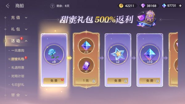 按顺序逐步解锁礼包,甜蜜星愿头像框、史诗皮肤自选箱、3日龙晶月卡、龙晶、星愿、礼券、龙魂祈福卡等多种奖励,累计可享500%返利。