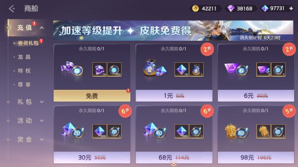 卷灵礼包限时直售,绘卷传说皮肤自选箱、龙晶、绘卷经验包、绘卷福袋、龙魂祈福卡等你来拿。
