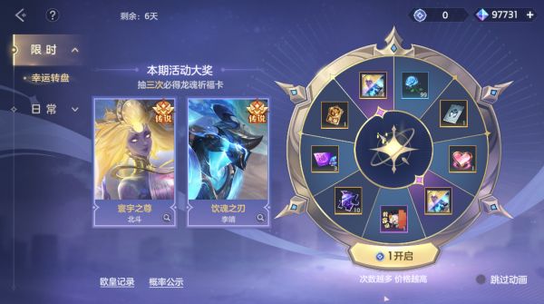 使用龙晶购买幸运币,进行抽奖。北斗·寰宇之尊、李靖·饮魂之刃、幸运星英雄自选箱、救命呀表情、龙魂祈福卡、皮肤碎片、改名卡等奖励等你来抽!最多3抽获得龙魂祈福卡,最多6抽获得一款皮肤,最多9抽可获得全部奖励,前2抽抽到皮肤(皮肤自选箱)的守护者会获得欧皇称号。