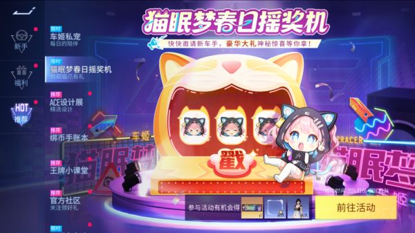 3月6日10:00:00-2026年3月26日23:59:59,车手们完成每日/进阶任务即可获取戳戳抽奖次数,参与抽奖就有机会获得王牌竞速机械键盘、王牌补给券、绑定纪念币、外观币等稀有道具!不仅如此,活动期间仅需登录1次游戏就可以直接领取全新时装-黑桃舞者,完成新玩家邀约任务还能获得甜猫驰梦名片以及更多王牌补给券奖励