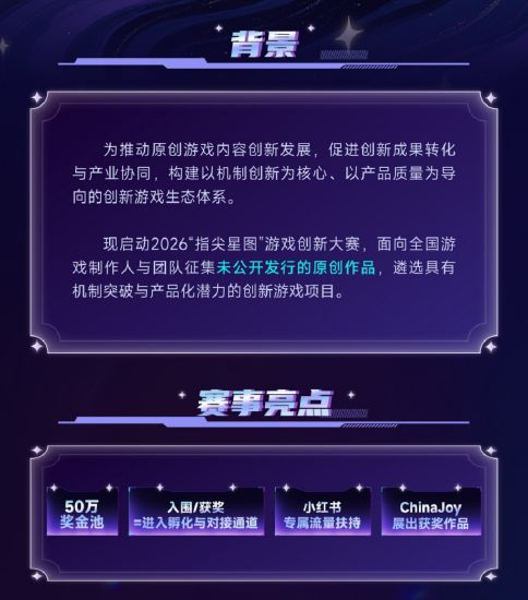 为深入贯彻创新驱动发展战略,推动原创游戏内容创新发展,促进创新成果转化与产业协同,构建以机制创新为核心、以产品质量为导向的创新游戏生态体系,中国音像与数字出版协会游戏工作委员会在多家会员单位的共同支持下,开展2026“指尖星图”游戏创新大赛活动。现将有关事项通知如下: