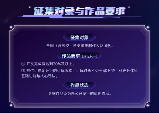 原创性要求:参赛作品须为原创作品或已取得合法授权,并提交原创/授权声明与合规承诺。 完成度要求:参赛作品开发完成度需达到30%及以上,或提交可稳定运行的可玩版本(可玩时长不少于30分钟),能够充分体验游戏基础功能及核心玩法内容。 合规要求:参赛材料须真实、完整、合法、合规,涉及第三方素材、音乐、字体、插件等须具备合法授权。