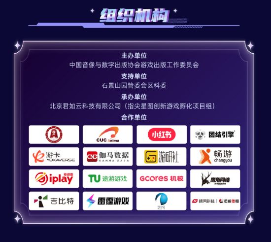 大赛由中国音像与数字出版协会游戏出版工作委员会主办,石景山园管委会区科委支持,北京君如云科技有限公司(指尖星图创新游戏孵化项目组)承办,北京师范大学艺术与传媒学院、中国传媒大学动画与数字艺术学院、小红书、杭州游卡网络技术有限公司、北京伽马新媒文化传播有限公司、北京竞游心声传媒文化有限公司、北京畅游时代数码技术有限公司、北京爱谱雷科技有限公司、在线途游(北京)科技有限公司、上海汉威信恒展览有限公司、Unity中国、上海鹰角网络科技有限公司、厦门吉比特网络技术股份有限公司、深圳雷霆信息技术有限公司、艺忛(厦门)网络科技有限公司、机核网等合作参与。