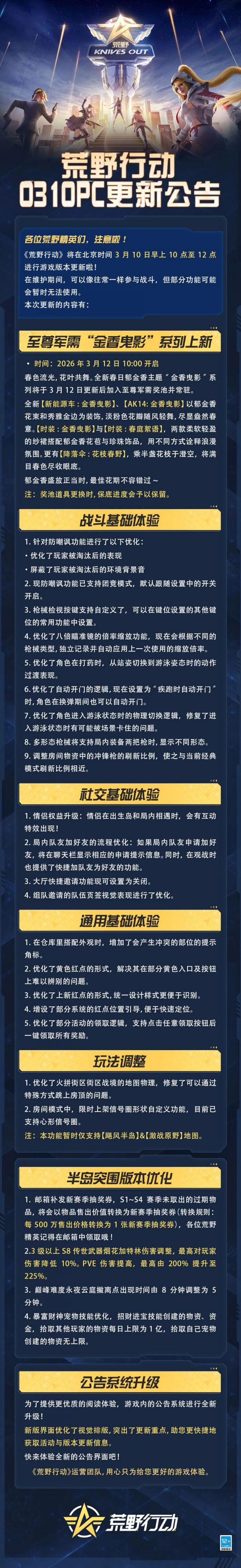 《荒野行动》将在北京时间3月10日早上10点至12点进行游戏版本更新啦!