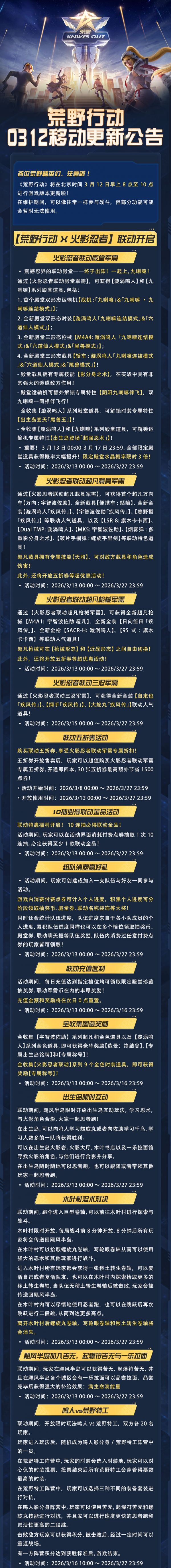 《荒野行动》将在北京时间3月12日早上8点至10点进行游戏版本更新啦!