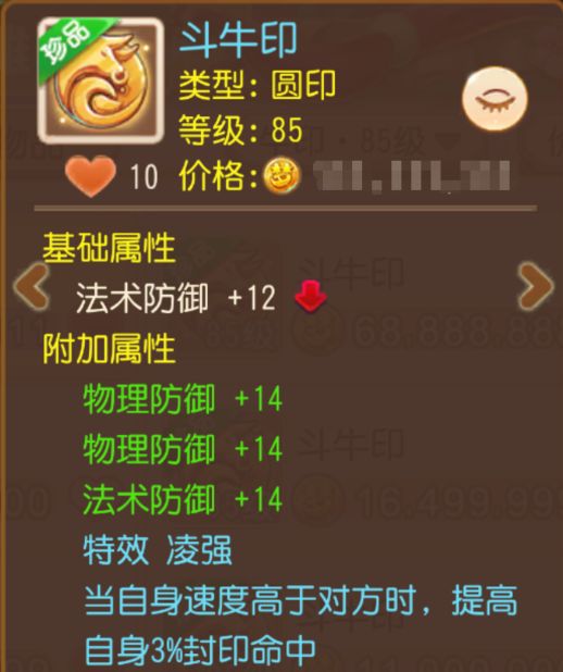 辅助玩家的“梦中情印”它来了!除了基础属性外,还附带3条防御属性。最核心的亮点在于“扶弱”特效——对气血低于50%的目标有额外的治疗结果加成。