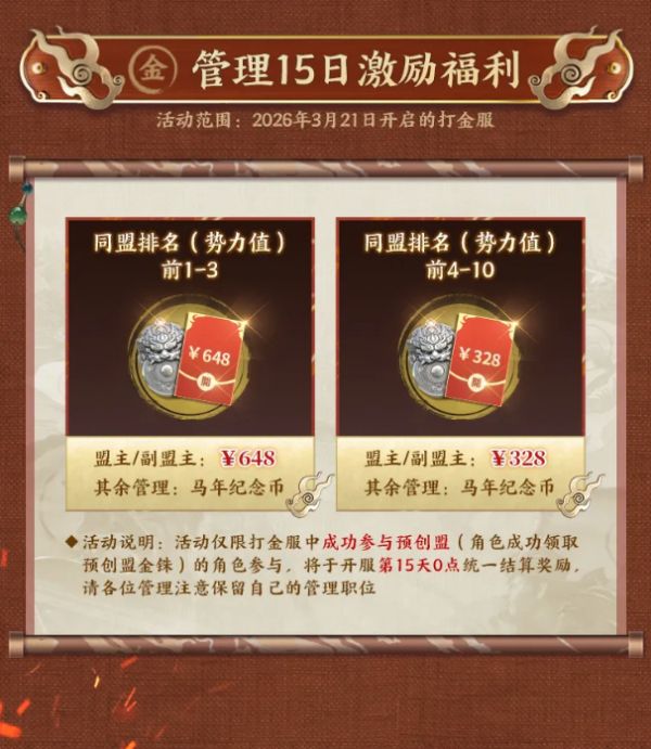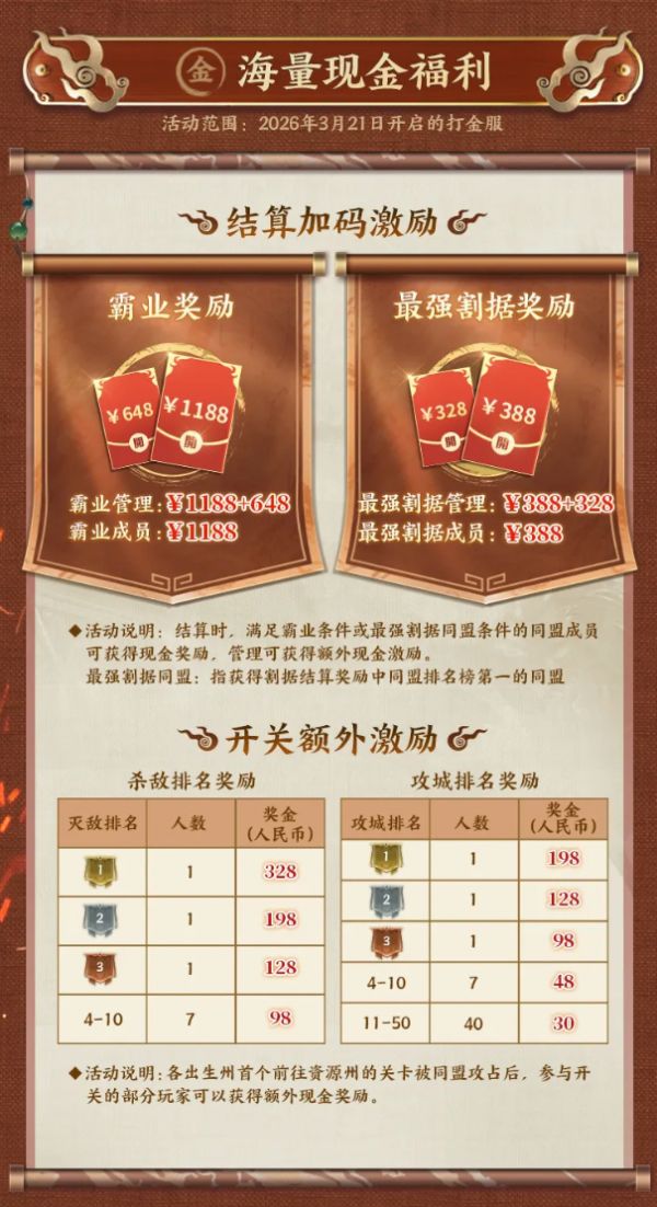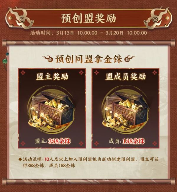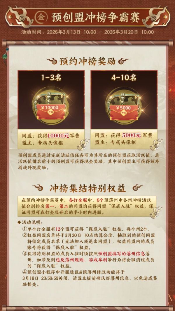 预创盟抢先领金铢!即日起至3月20日,主公抢先预创盟,盟主和盟成员均必得金铢好礼,完成冲榜争霸赛任务单盟最高可得10000元现金军费,还有“保底入驻”权益和额外管理现金红包~