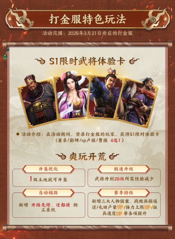 登录打金服即可自选曹操、sp卢植、貂蝉、董卓S1限时体验卡四选一;极速升级、1级开垦、自动铺路、特性提升助主公爽玩开荒!