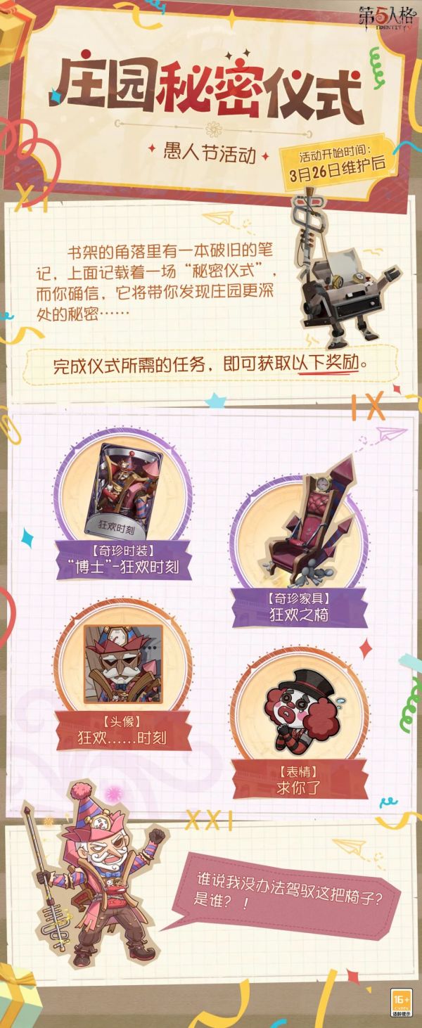 “庄园秘密仪式”愚人节活动将于3月26日维护后开启,完成活动任务,可免费领取【奇珍时装】“博士”-狂欢时刻等奖励~