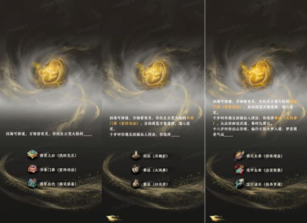 【出身】:影响新手礼包,商贾之后(灵石、材料)、书香门第(神通/功法)、将军后代(装备);推荐书香门第+剑+修元长青开局,输出高修炼快,更快节奏推图发育,容错率也更高