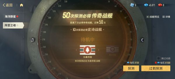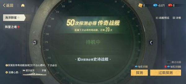 ♦ 海洋群星:可使用蓝钻或舰队密函进行探测,每50次探测必定获得传奇战舰,并且可以设定心愿战舰来提升特定战舰的探测概率。