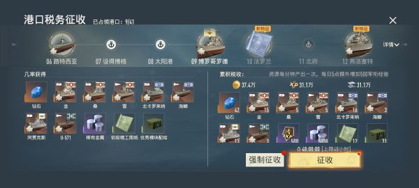 随着时间的推进和已占领港口数量的增加,舰长可在港口税务征收中获得大量战舰碎片奖励!