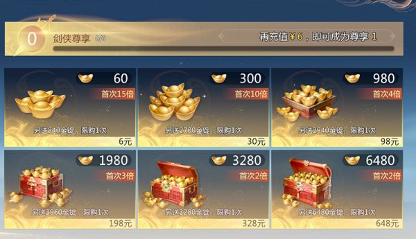 ○ 重置后,每个档位金锭充值都可以享受首充额外返利。