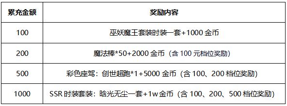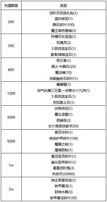 奖励说明:充值达到对应金额,即可领取该档位及以下所有奖励