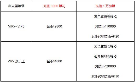 活动时间内,所有线下名人堂VIP5及以上玩家,在活动期间内的充值,达到要求后可以获得额外奖励哟!(只能领取对应VIP等级奖励)~