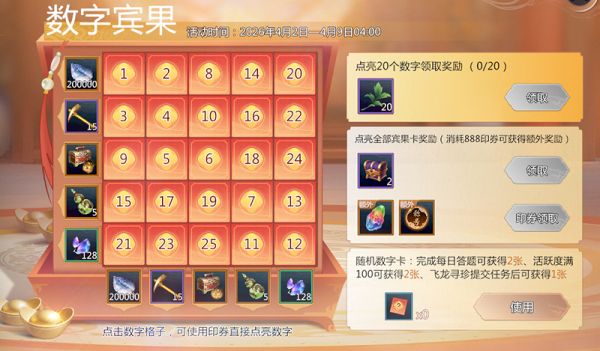 活动期间,完成指定玩法可以获得随机宾果数字卡,完成宾果数字卡收集可获得岁华葫芦、潜龙锥、百炼/琅华符章自选宝箱等好礼,更有万象灵石、灵核自选礼包、特殊称号等你来领。