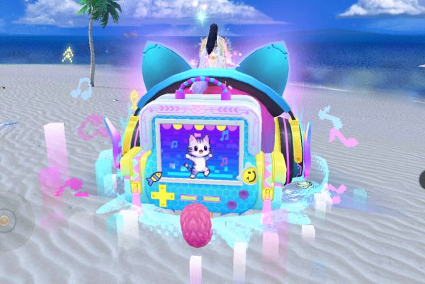 一转身,背后竟背了个巨大的游戏掌机,屏幕里一直奶呼呼的小猫咪随着音乐节拍,开心地不断蹦跶。像素风的光效随节奏闪烁,像把整个电玩城的热闹都浓缩在了这一方屏幕里。