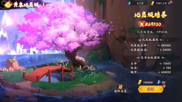提升式神的属性除了升星外,还可以在黄泉比良坂消耗魂寮和金币进行提升,同时也会对所有忍者追加属性。
