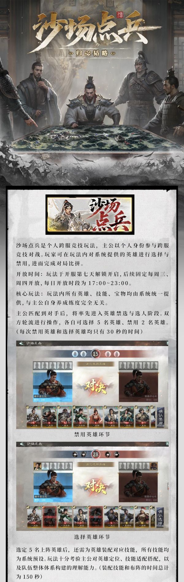沙场点兵是个人跨服竞技玩法,主公以个人身份参与跨服竞技对战。玩家可在玩法内对系统提供的英雄进行选择与禁用,进而完成对局比拼。