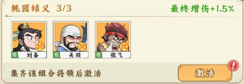 【桃园结义】刘备+关羽+张飞,激活后最终增伤+1.5%;