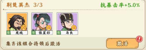 【荆楚英杰】庞统+张星彩+马良,激活后抗暴击率+5.0%;