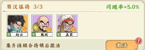 【蜀汉猛将】赵云+魏延+孟获,激活后闪避率+5.0%;