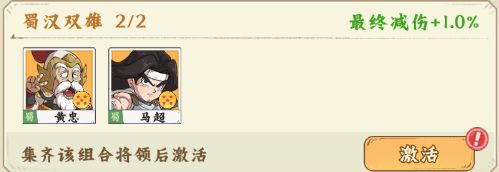 【蜀汉双雄】黄忠+马超,激活后最终减伤+1.0%;