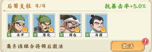 【后蜀支柱】关平+廖化+周仓+马谡,激活后抗暴击率+5.0%;