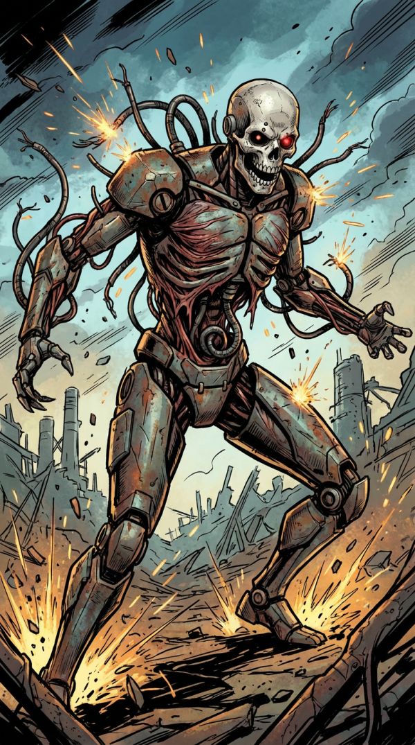 链骸是一具锈蚀残破的骷髅机械尸骸,外露缠绕的电路管线,猩红双眼透着刺骨寒意,末日废土的破败外形极具压迫感。