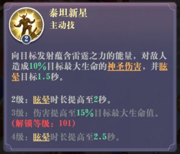 二技能释放泰坦新星攻击敌人,造成目标10%最大生命值的神圣伤害,无视防御免伤,同时眩晕目标1.5秒。