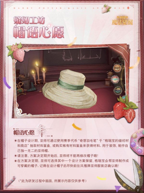 -在方案决定期,巫师可选择其中一个设计方案保留,格瑞宝会帮巫师制作成可穿戴的帽子。记得在设计帽子后尽快前往风雅牌巫师服装店确认哦!