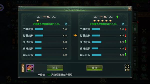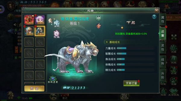 灵兽还童:还童是提升灵兽成长潜力的核心玩法。通过还童,可以改变灵兽的成长属性和附加的减伤效果。还童设有星级体系,从低到高依次为:下品、中品、上品、鸿蒙、天尊。每个品级包含1-5星级,品级星级越高,灵兽的综合实力越强。