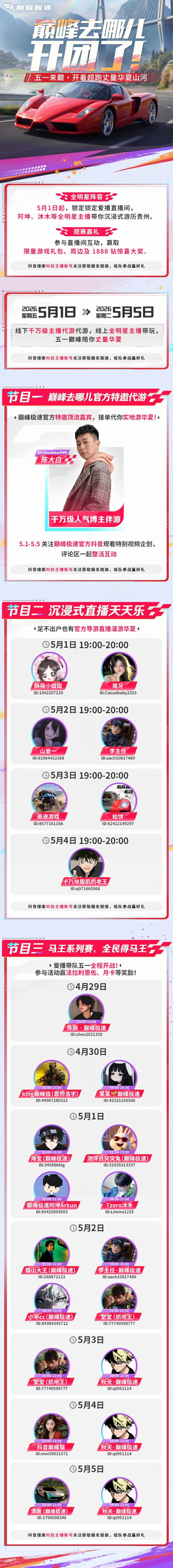 从5月1日起,我们将开启一场持续整个假期的“全民操控式云漫游”。我们将派出由全明星主播组成的“金牌导游团”全程在直播间待命!带大家沉浸式漫游不同赛道!他们不仅技术超群,更化身“云导游”,一路讲解风景彩蛋、分享驾驶心得,甚至直播间互动即停即玩!